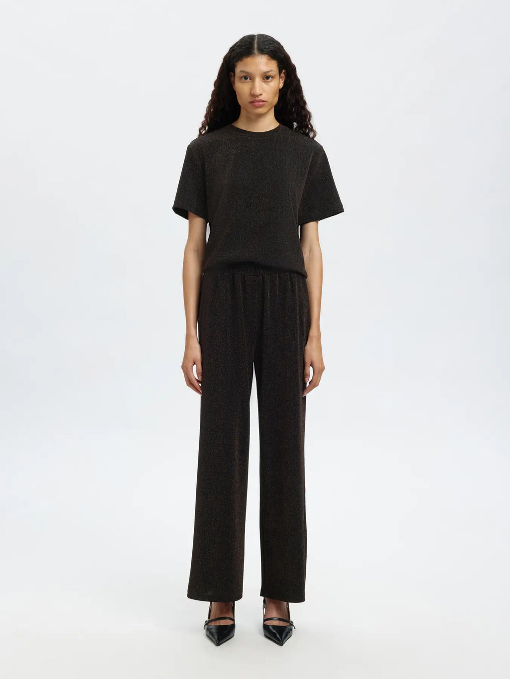 Selected Anja housut ovat keveät päälläsi. Housujen materiaali on ihanan ohutta ja joustavaa, joten käyttömukavuus on taattu. Malliltaan housut ovat rennon istuvat ja mukavat käyttää monessa menossa. Selected Anja housujen lahkeet ovat suorat ja täyspitkät ja housujen korkeassa vyötärössä on kuminauha. Selected Anja housujen kankaassa o upea glitter-efekti. Kenkiä, asusteita ja yläosaa vaihtamalla saat luotua Selected Anja housujen ympärille erilaisia tyylejä.