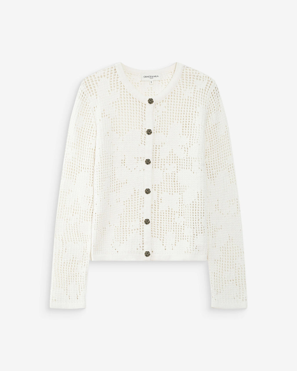 Grace & Mila Velasquez neuletakki on ajattoman tyylikäs ihanuus. Neuletakki on ihanan pehmeää, pitsikuvioitua puuvillaneulosta ja sopii yhdistää asuun kuin asuun. Grace & Mila Velasquez neuletakissa on edessä messinkiset koristenapit, jotka voit halutessasi sulkea tai pitää auki. Malliltaan Grace & Mila Velasquez neuletakki on rennon istuva. Neuletakin malli imartelee kaikkia vartalotyyppejä eikä myöskään kutita herkempääkään ihoa.