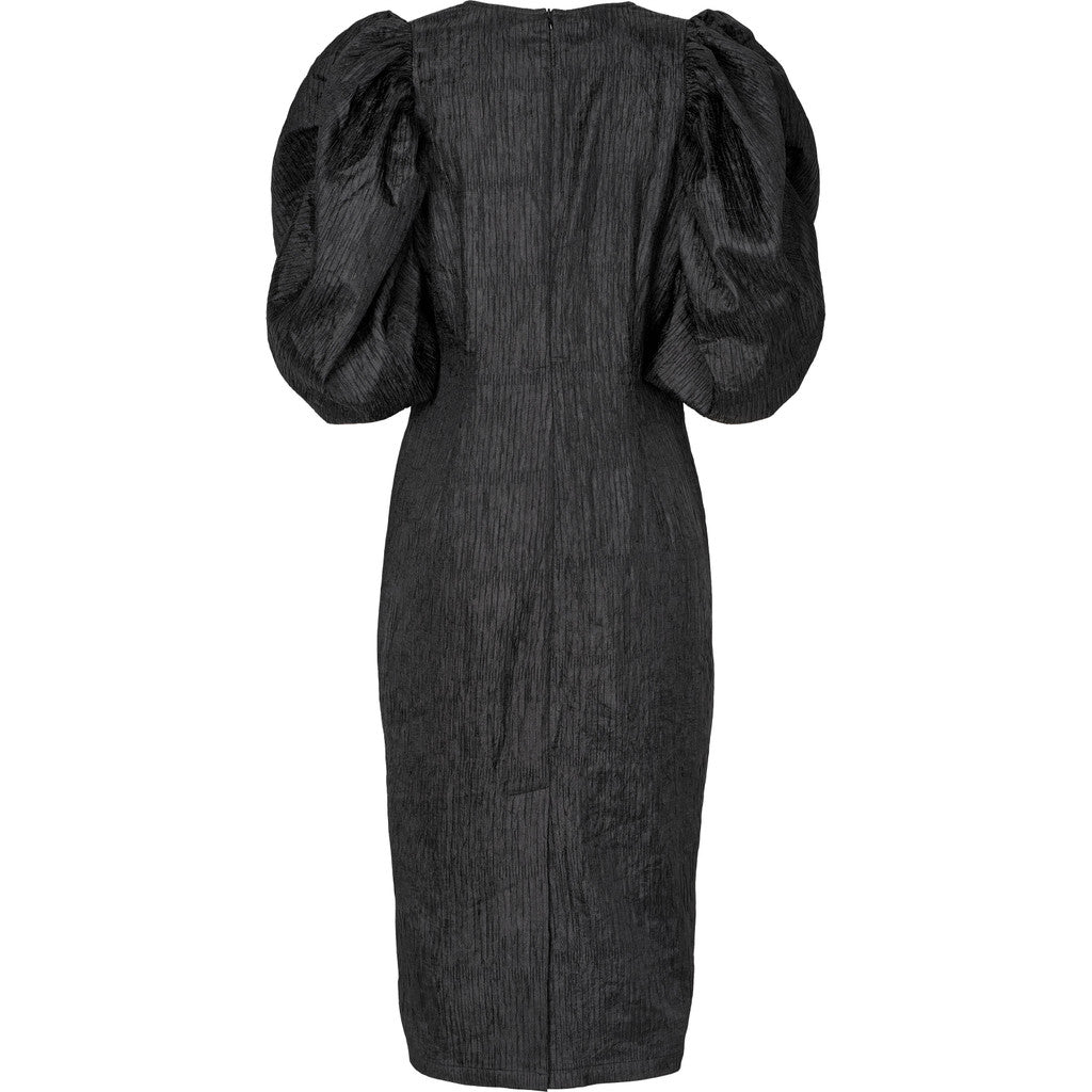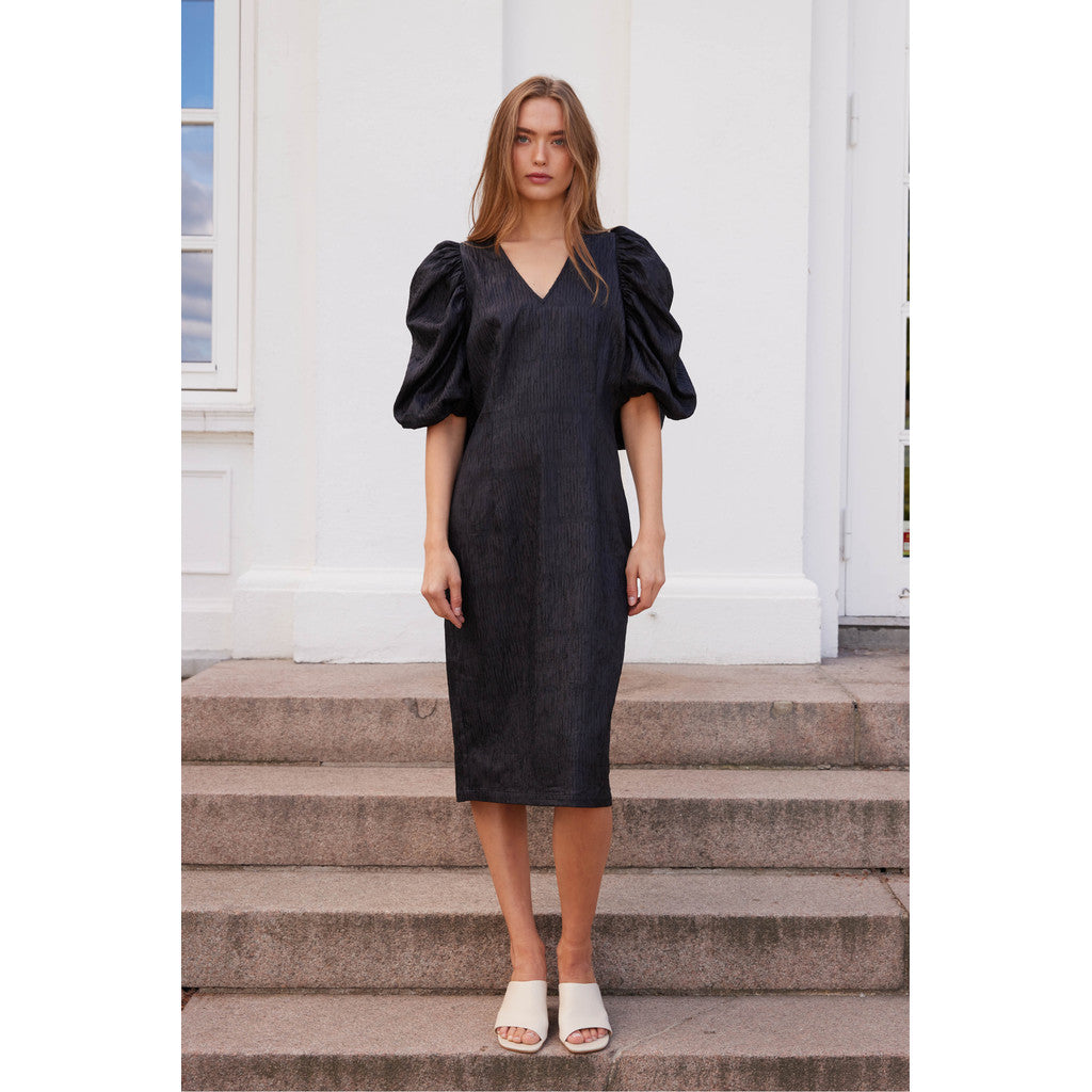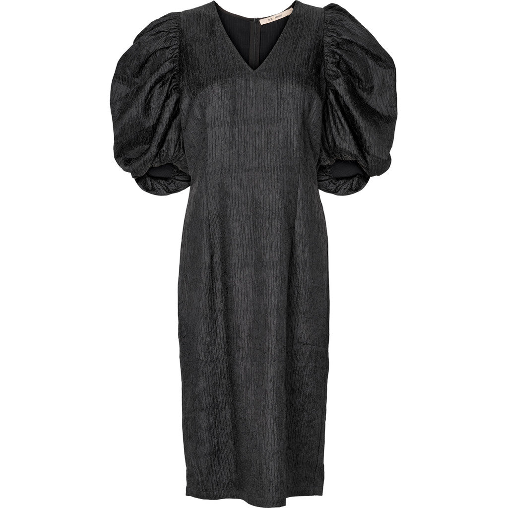 Rue de Femme Lyric mekko on naisellisen upea lisä vaatekaappiisi. Mekon malli on suora ja siinä on v-aukkoinen kaulus sekä upea kohokuviointi kankaan pinnassa. Mekossa on näyttävät vajaamittaiset hihat, jotka pussittuvat kauniisti. Pituudeltaan mekko on midimittainen. Rue de Femme Lyric mekko on monikäyttöinen mekko, jonka ympärille saat luotua monenlaisia tyylejä. Saat tyyliisi rikottua ilmettä yhdistäessäsi mekon lenkkareiden tai maihareiden kanssa tai kun puet mekon päälle nahkatakin. Huomioithan mekon kokoa valitessasi että mekon materiaali ei jousta. Mekon takana on vetoketju helpottamassa mekon päälle pukemista.